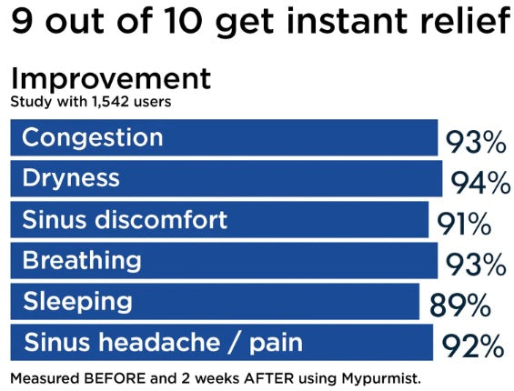 • Mypurmist steam inhalers are proven to provide fast, natural, drug-free relief from allergies, sinus congestion, sinus pain, dryness, colds and flu.
